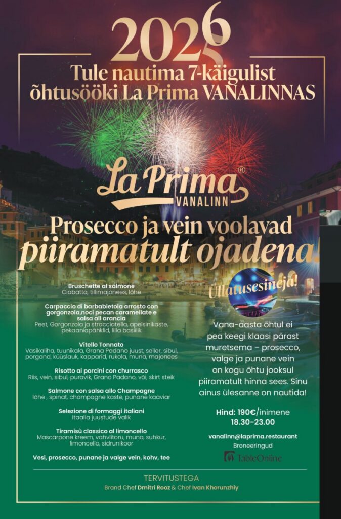Kutsume Sind 31. detsembri õhtut veetma La Prima Vanalinna aastalõpu õhtusöögile. 🥂Sel erilisel õhtul serveerime 7-käigulist Itaalia menüüd, mis toob Sinuni vana-aastaõhtuksparimad maitsed – prosecco ja vein voolavad seejuures piiramatult kogu õhtu vältel. 🍽 MENÜÜ: Tiramisù classico al limoncello – Mascarpone kreem, vahvlitoru, limoncello, sidrunikoorAlustame kell 18.30 ning võõrustame Sind ja Sinu seltskonda kuni kella […]